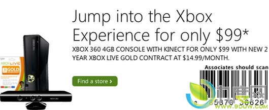 微软官方今天宣布,公司将计划以99美元的价格销售一款Xbox 360套装。据悉,该款Xbox 360套装包含一台存储容量为4GB的Xbox 360、一台Kinect体感游戏设备,以及为期2年、每月14.99美元的Xbox Live金牌服务。不过遗憾的是,该款Xbox 360套装只能通过微软专卖店购买。