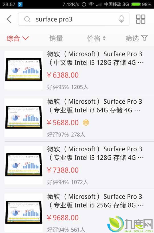 目前在易迅网以及京东手机端上,配备i5处理器以及128GB固态盘的Surface Pro 3的价格已经降到了6388元,而它在微软官方商城的价格则是7388元,暴降了足足1000元。虽然如此,相信官方也很快调价。