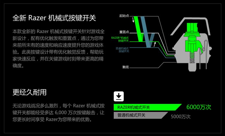 这两款键盘均采用Raze专为游戏打造的绿轴,50g触发压力,按下1.9mm即可触发,并且触发点与重置点的间距比普通机械键盘按键开关少一半,连续按键的效率更高。此外,还具备6000万次超强耐用性,适合高强度游戏。